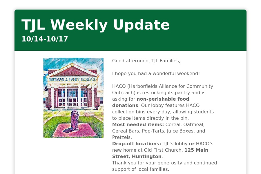 TJL Weekly Update 10/14-10/17 Good afternoon, TJL Families, I hope you had a wonderful weekend! HACO (Harborfields Alliance for Community Outreach) i. . .