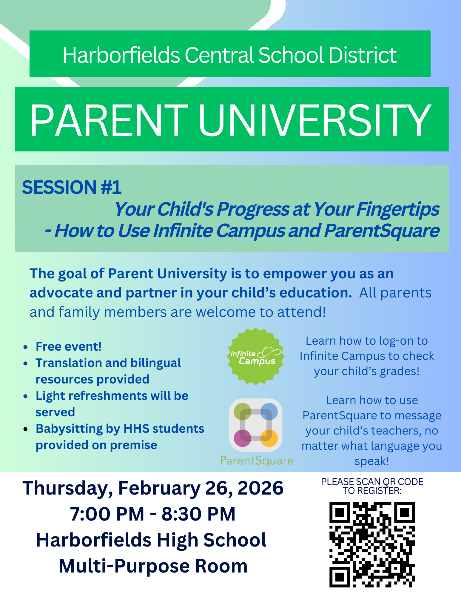 Join us on Thursday, February 26th at 7:00 p.m. in the Multi-Purpose Room at Harborfields High School for a powerful Parent University session.  The goal of our Parent University program is to empower families as partners in their child's education. Click on the image below for more information.